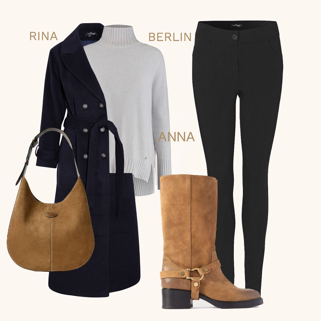 Opt for a sophisticated look with an edge by pairing Berlin ink with our organic cotton jumper Jackie in ivory and layer up to beat the cold with wool cashmere blend coat Rina. Finish the look with a pair of cool boots and matching totebag. The day is yours to take!