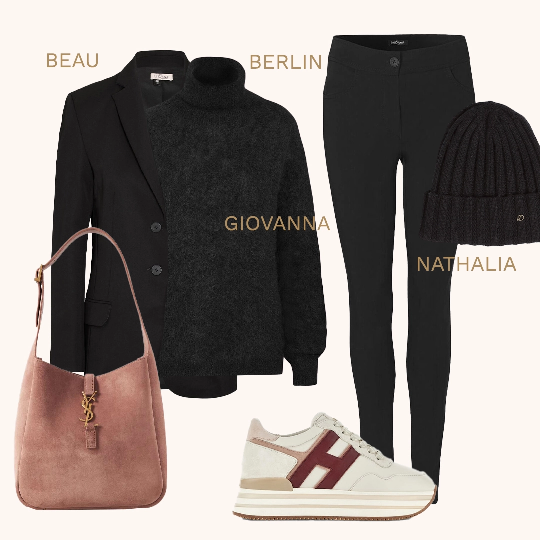 Nothing beats a timeless black look. Pair Berlin black with our cozy and cocoon proof alpaca blend jumber and add some business with oversized blazer Beau. Add a pop pop of color with chuncky sneakers and a bag to hold your goodies.