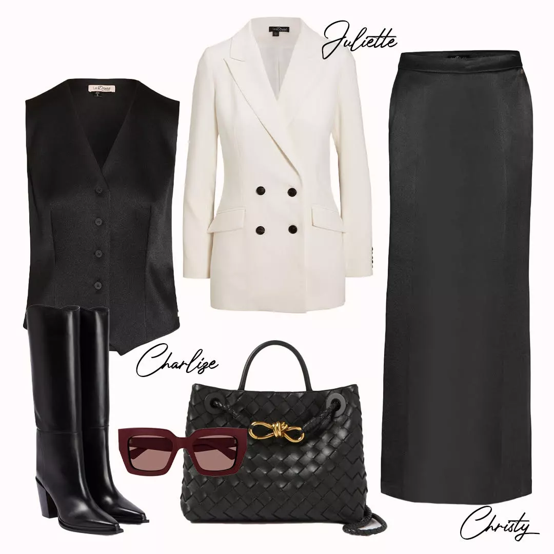 Suit up the skirt way with Christy! Opt for a chic look by pairing our maxi shirt with must-have crêpe satin vest Charlize and layer up with blazer Juliette in ivory for a fresh touch. High boots and a statement bag to seal the deal.