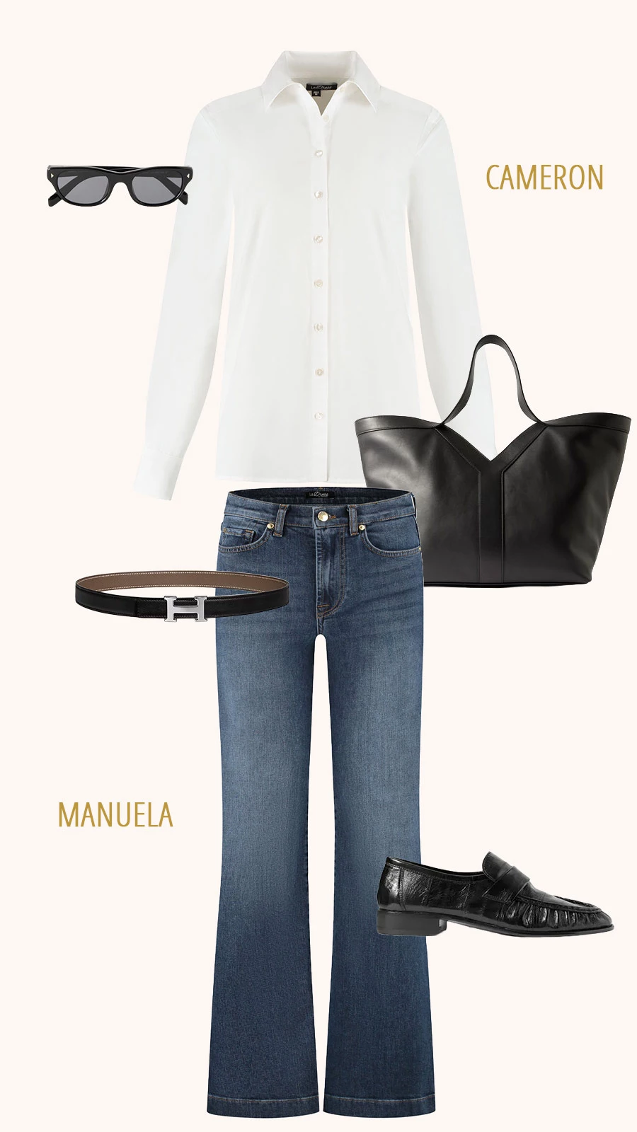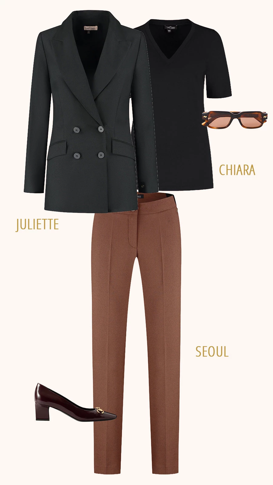 By wearing the Monica Black and the Geneva Ivory together with heels and a bulky handbag, you combine these styles effortlessly.