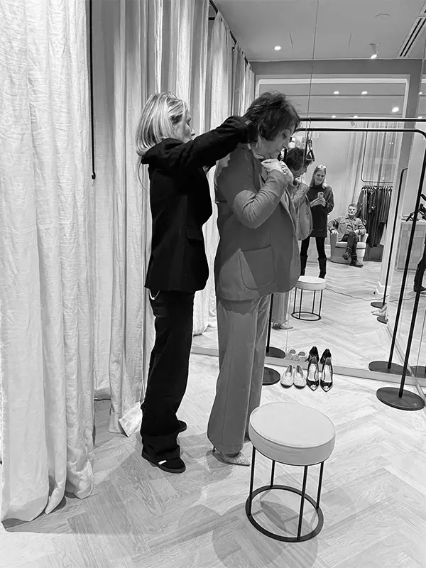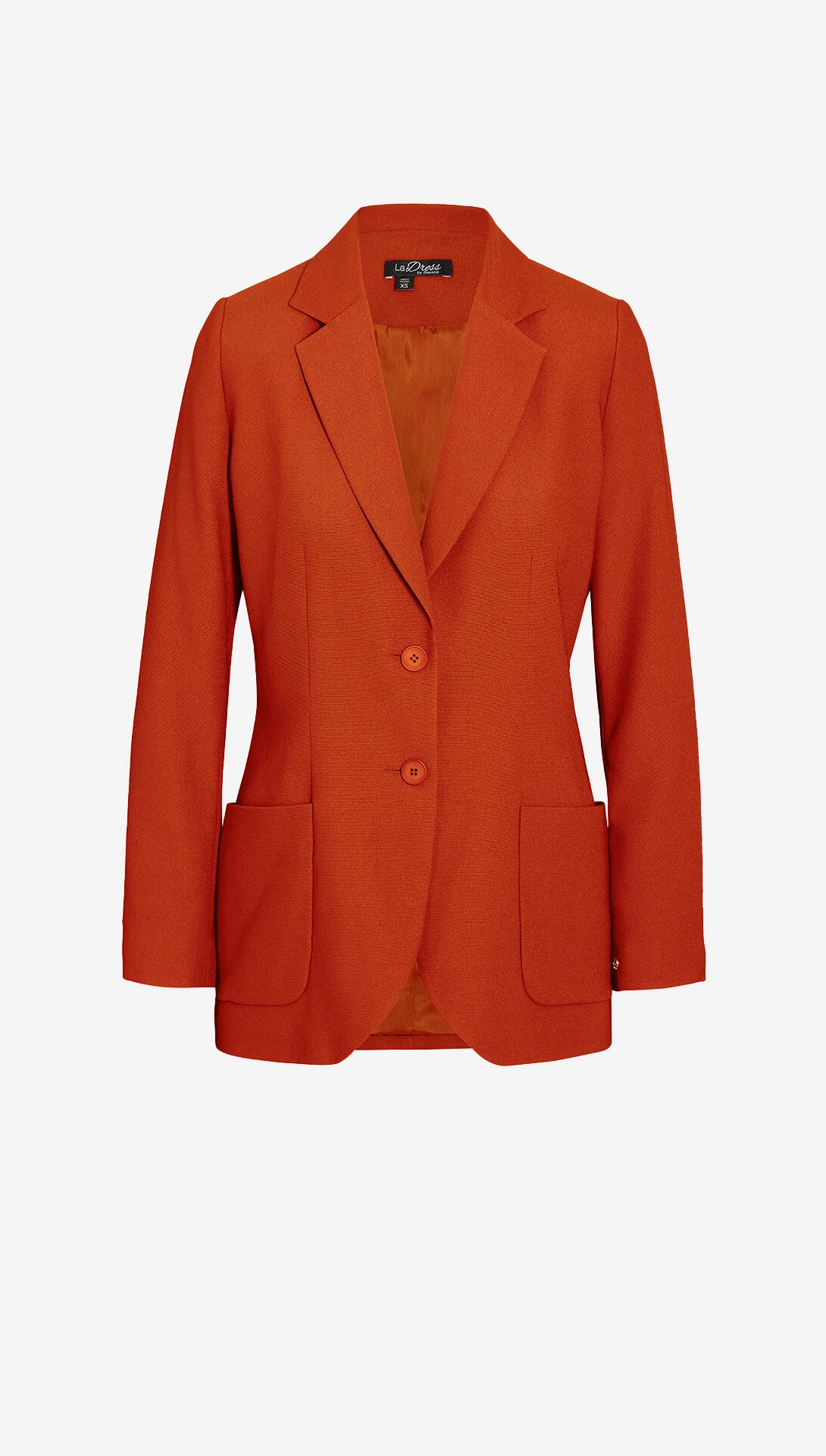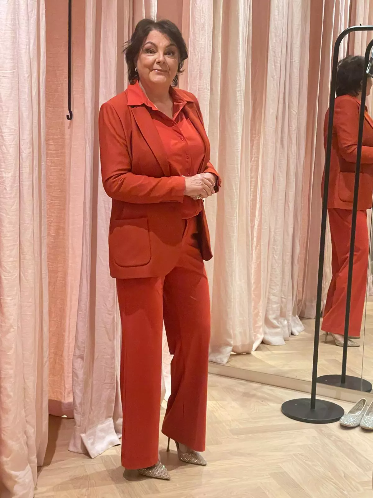 Voor Jenny kozen we voor een krachtige kleur die haar doet stralen. Auburn! In een mix van crêpe satin en travel jersey. Ze draagt blazer CAREY, blouse IRENA en broek LUGANO.