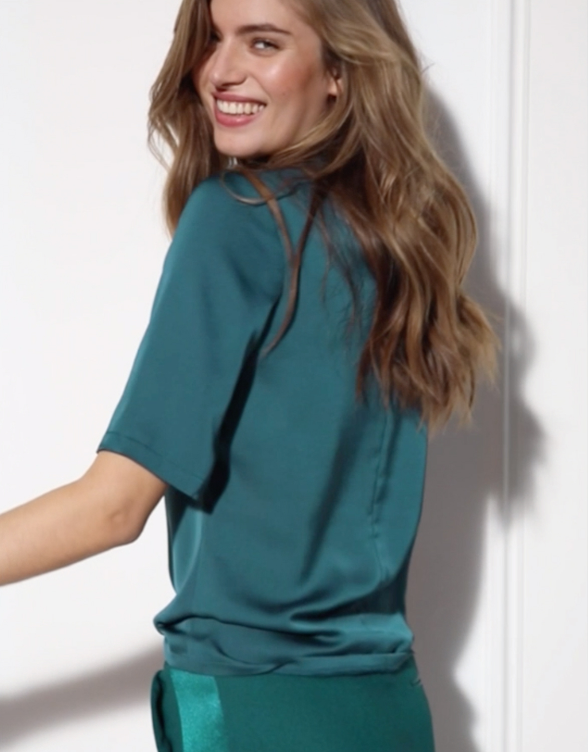 Deze pantalon met rechte pijpen draag je gemakkelijk van kantoor naar een diner. Porto is gemaakt van een soepele crêpe satijnen stof, gedetailleerd met satijnen accenten zoals het paneel op de zijkant, het zakje aan de achterkant en de elastische tailleband. Maak je look compleet met de bijpassende Sinéad blouse.